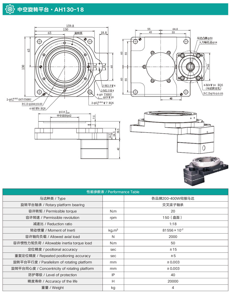 中空旋轉(zhuǎn)平臺(tái)是一種全新的旋轉(zhuǎn)負(fù)載裝置,它集高傳動(dòng)效率、高精度、高剛性、高性價(jià)比與一身,綜合了伺服馬達(dá)、凸輪分割器直驅(qū)馬達(dá)的優(yōu)勢(shì)。使用高精度齒輪結(jié)構(gòu)和徑向軸承,提高了扭矩和剛性,承載更穩(wěn)重,搭配伺服馬達(dá)或步進(jìn)馬達(dá)可做任意角度分割,即可滿足分割器無(wú)法實(shí)現(xiàn)的位數(shù)控制,定位精度又可媲美直驅(qū)馬達(dá),可在段時(shí)間內(nèi)實(shí)現(xiàn)慣性負(fù)載的定位。
